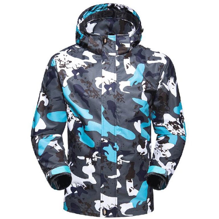 Men's winter sports jacket with a hood and drawstrings for tightening. Waterproof and windproof. Collar at the neck and zip fastening. Two side pockets. Grey camouflage pattern combined with colour. Available in two variants.
