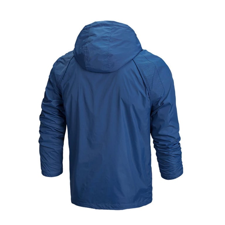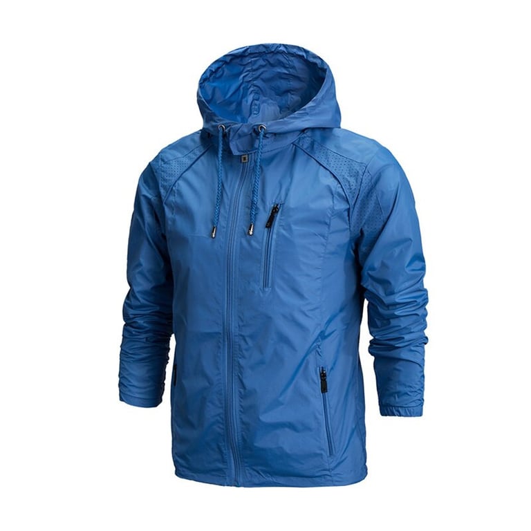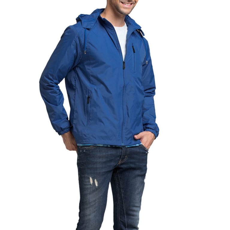 Men's lightweight jacket with a hood and drawstrings. Lightweight. Waterproof and windproof. Zip fastening. Side pockets and one chest pocket. Available in multiple colour options.