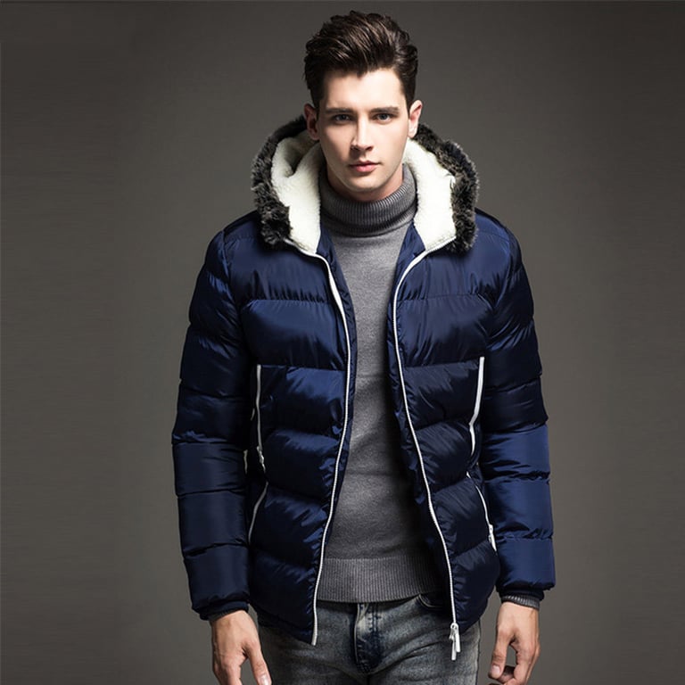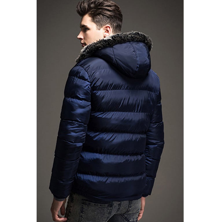 Men's winter padded jacket with a zip fastening and a hood. The jacket features two large side pockets and the hood is insulated with fur. Available in various colour options.
