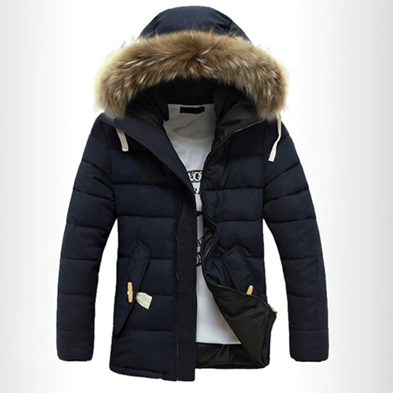 Men's winter padded jacket with a zip fastening, two side pockets, and a hood with a large warm fur lining. Available in three colours.