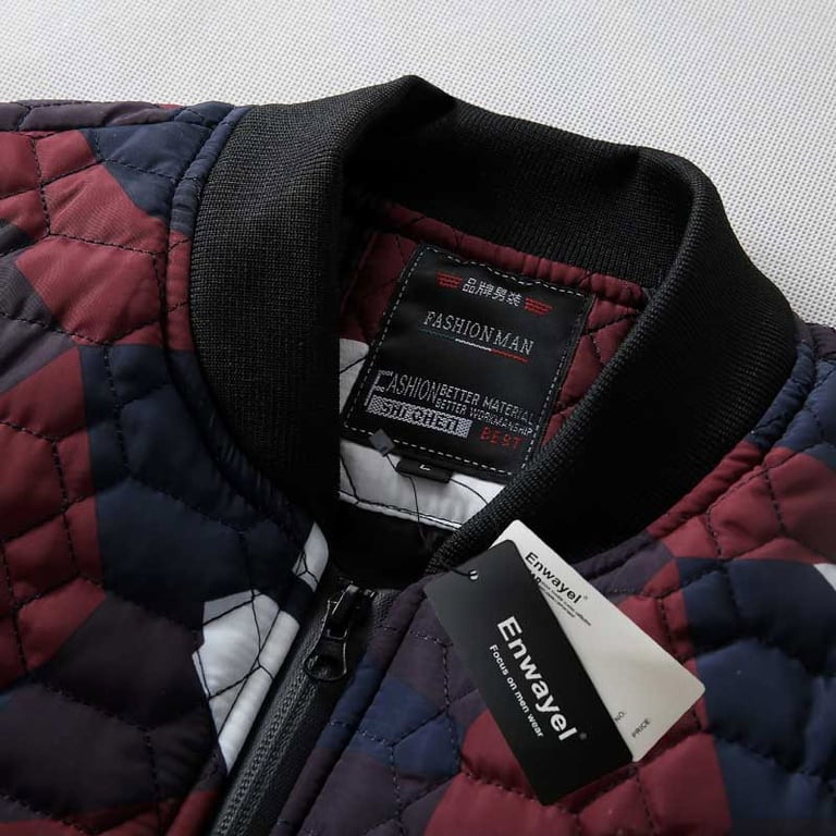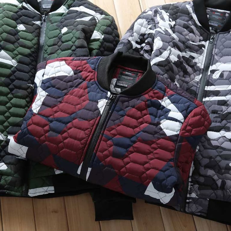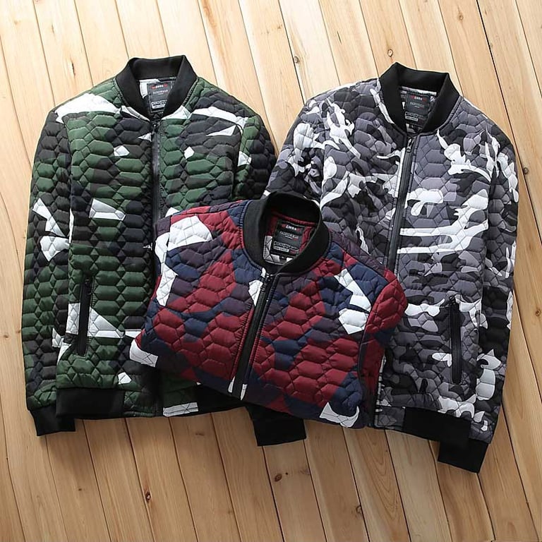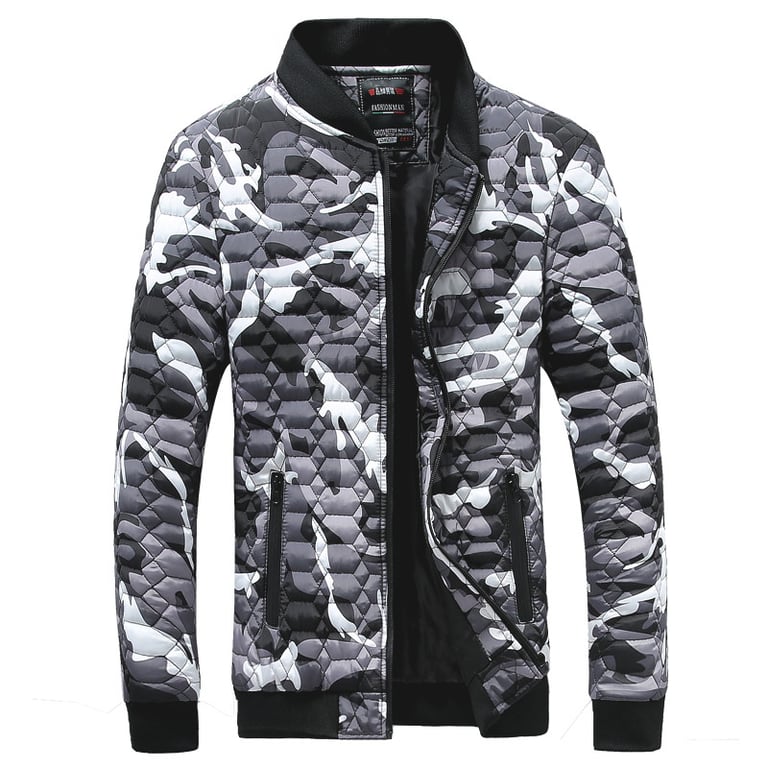 Stylish men's lightweight jacket with quilting and camouflage print. Without a hood, featuring a collar at the neck. Zip fastening and two side zip pockets. Available in several colour options.