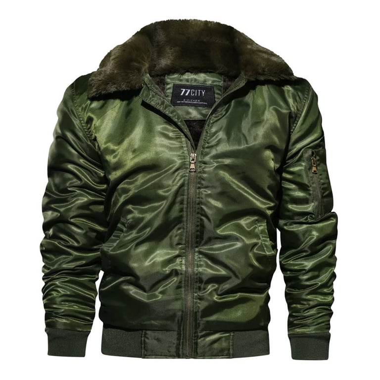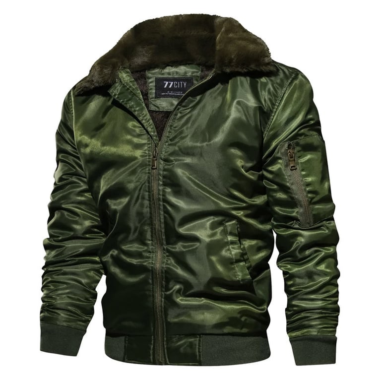 Stylish men's winter bomber jacket. Without a hood, featuring a large fur collar. Elastic waistband and zip fastening. Side pocket on the sleeve with a zip. Available in three colour variants.