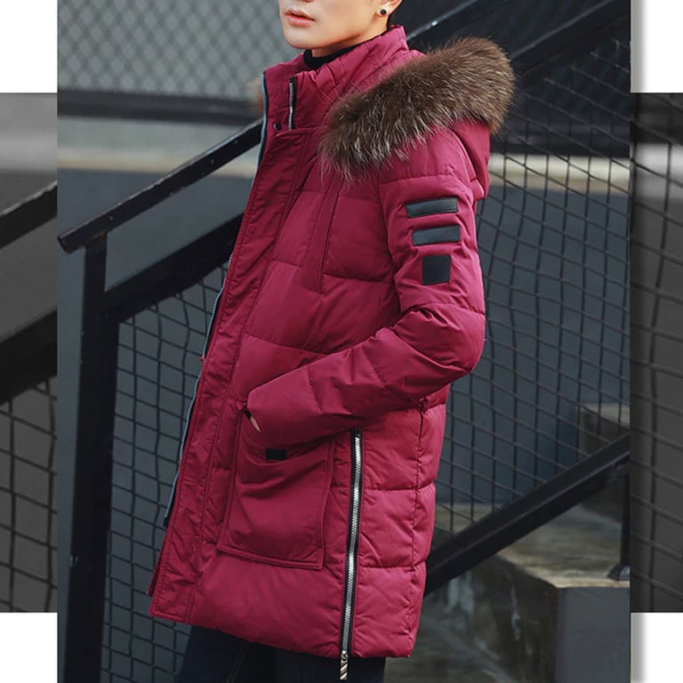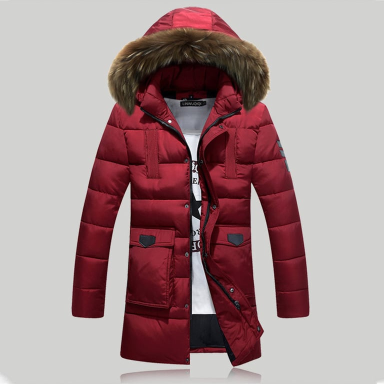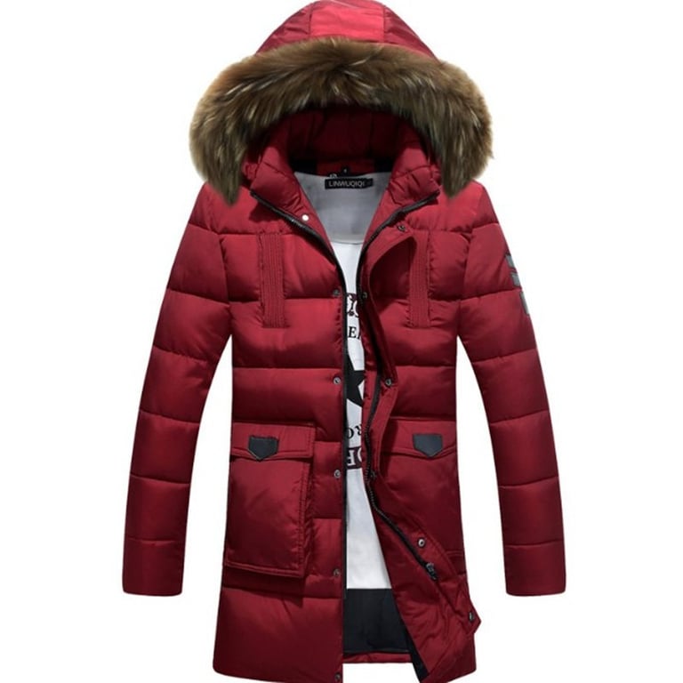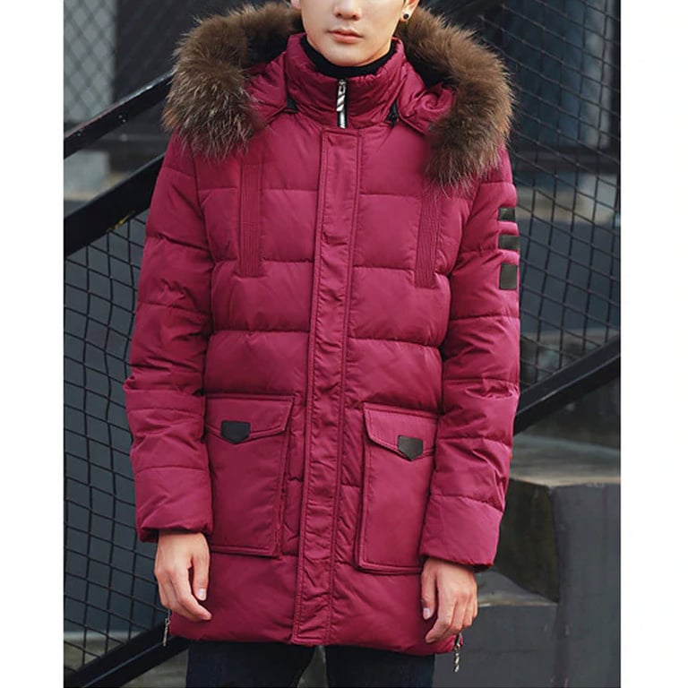 Men's long padded parka with a hood and faux fur. The jacket features two large side pockets and a zip and snap fastening. Available in several colour variations.