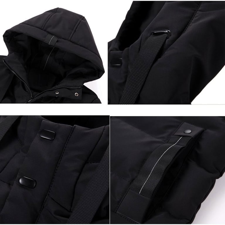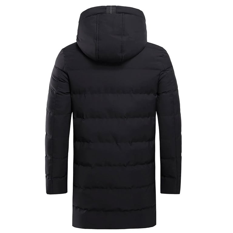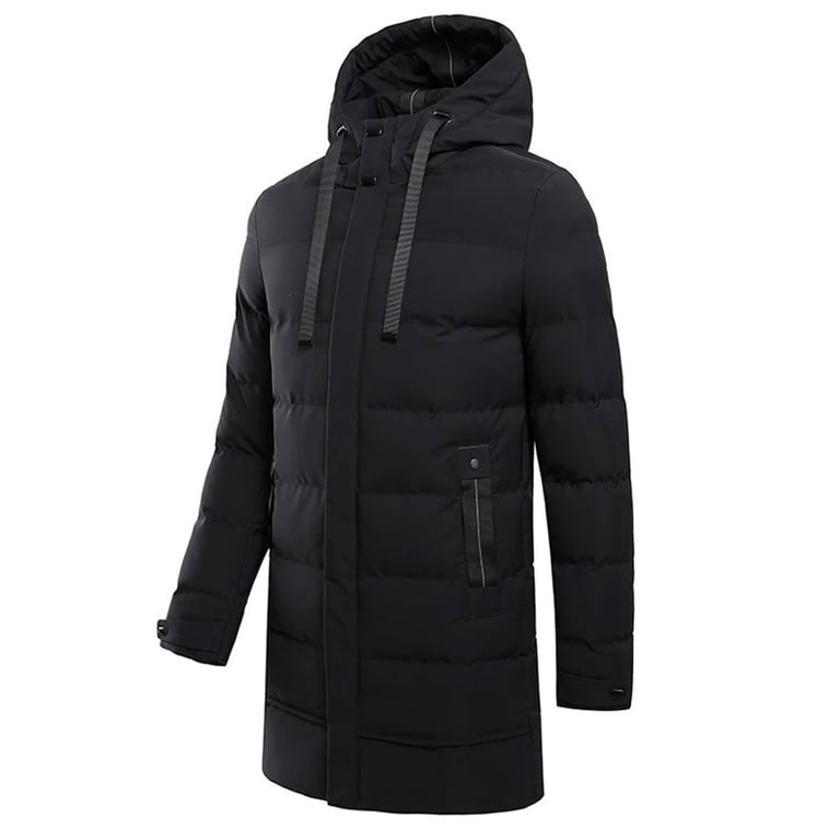 Men's winter padded jacket. The jacket features a zip fastening, an adjustable hood with drawstrings, and a two-button fastening at the neck. Two side pockets with zips. Lightweight, longer cut. Available in three colours.
