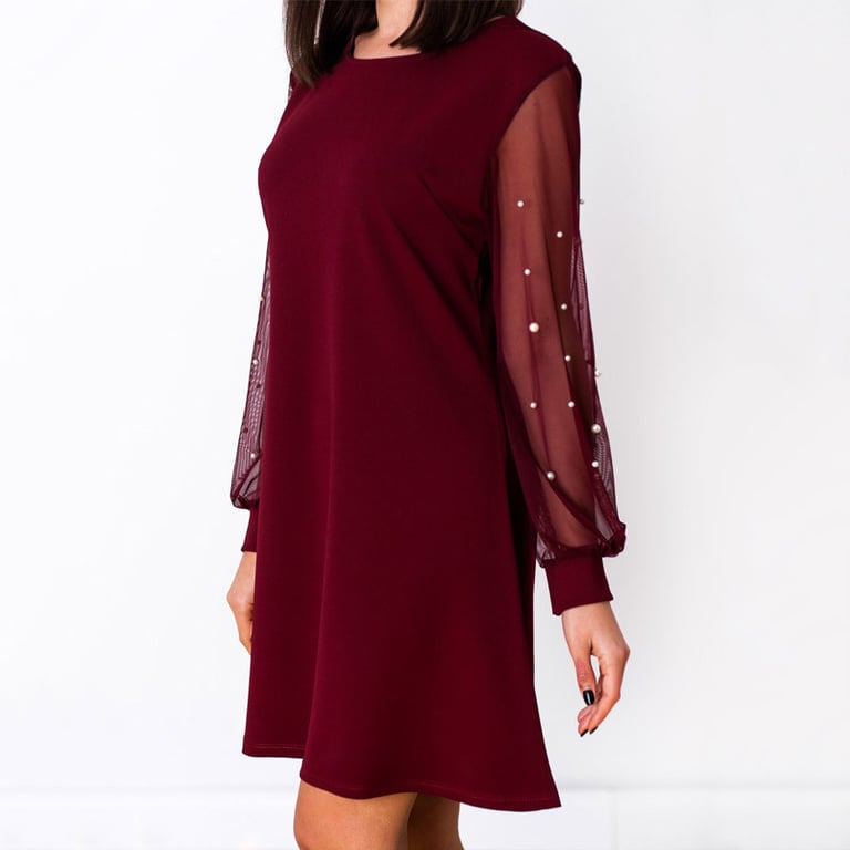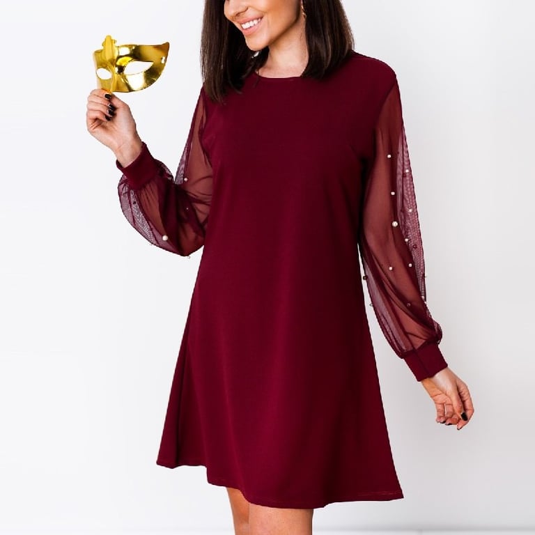 Women's short dress with long tulle sleeves adorned with white pearls. The dress has a loose, comfortable fit with a length above the knee and a round neckline. Ideal for a ball or party. Available in two colours.