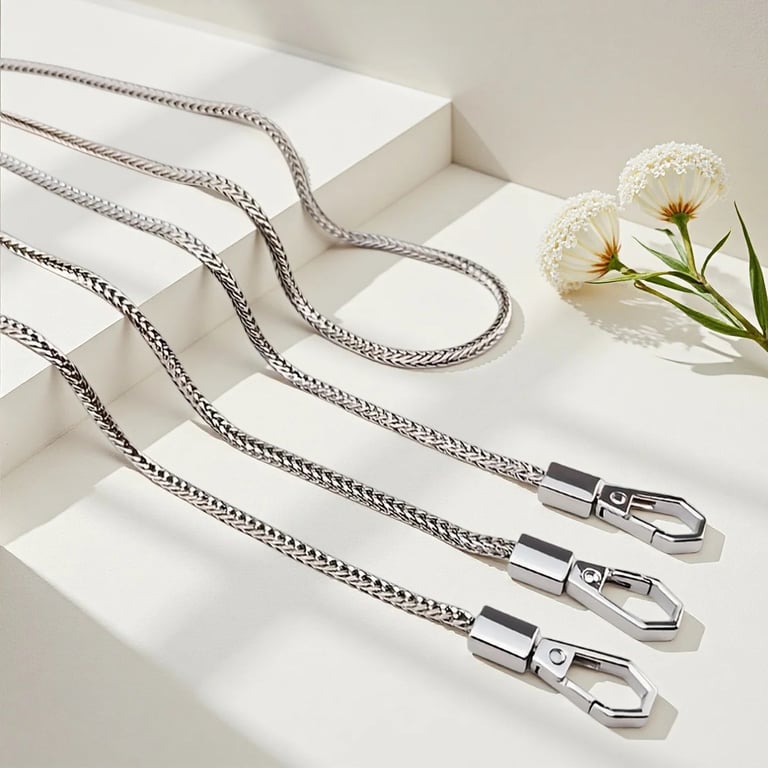 This neck and shoulder strap for mobile phones is made from a sturdy silver-coloured metal chain and serves as a stylish, durable and secure accessory for the phone. It includes an adaptor that is inserted between the phone and the case (suitable for most cases), and a sturdy carabiner for attaching the phone or keys. The metal chain, thanks to its length, is comfortable to wear on the shoulder and across the body, looks attractive as a fashion accessory, and reliably prevents the phone from dropping or getting lost.