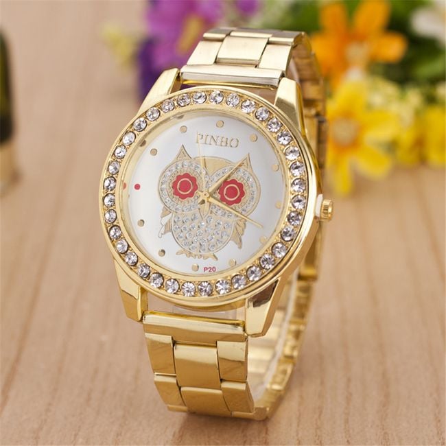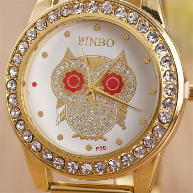 The metal watch with an owl features a dial adorned with sparkling stones.