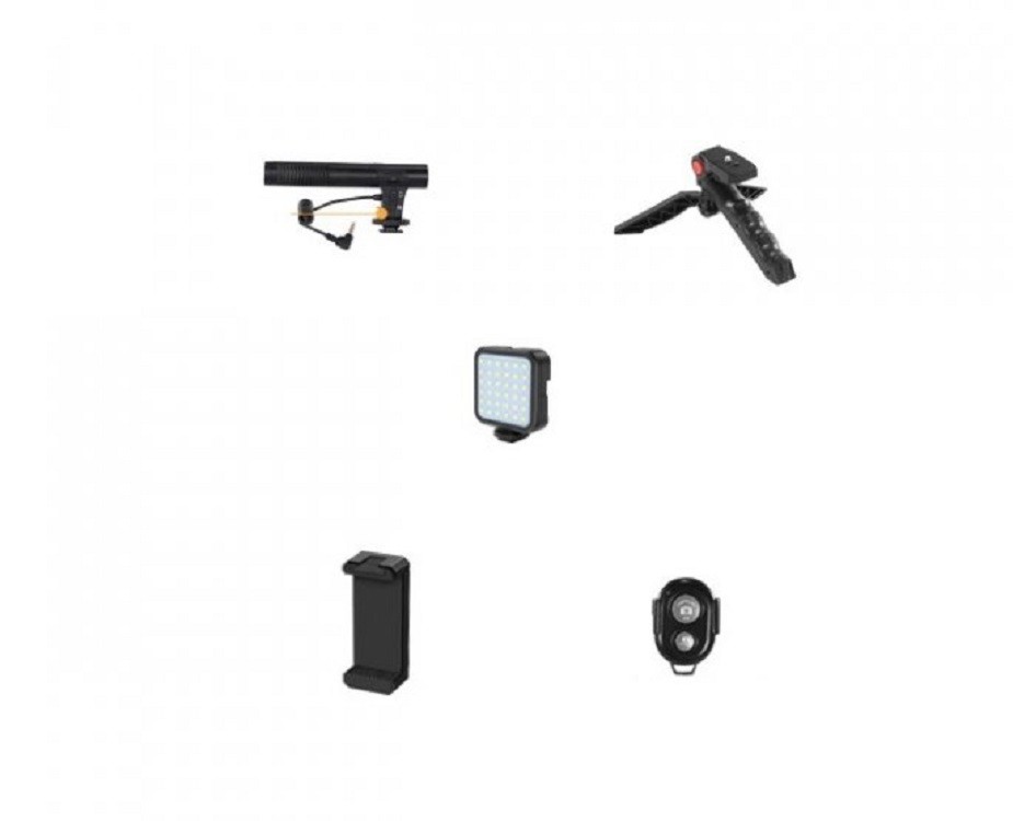 Package Contents: 1x microphone, 1x stand, 1x LED light, 1x phone holder, 1x trigger