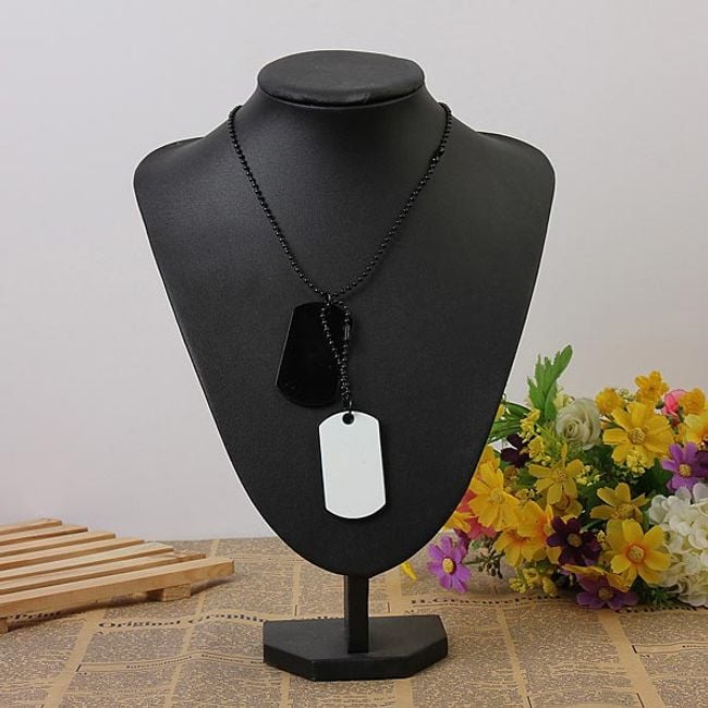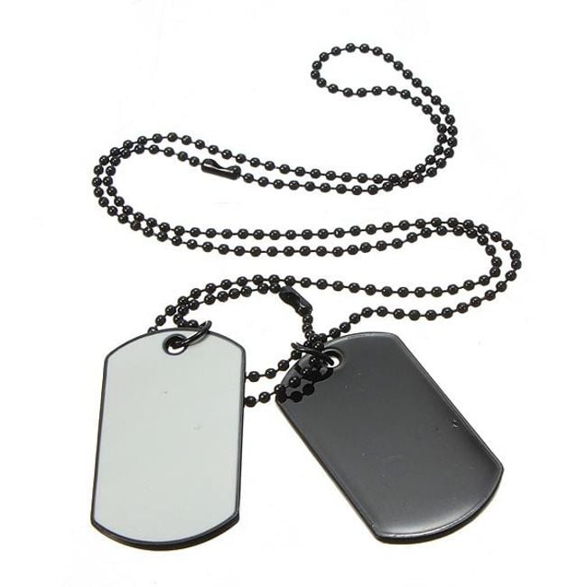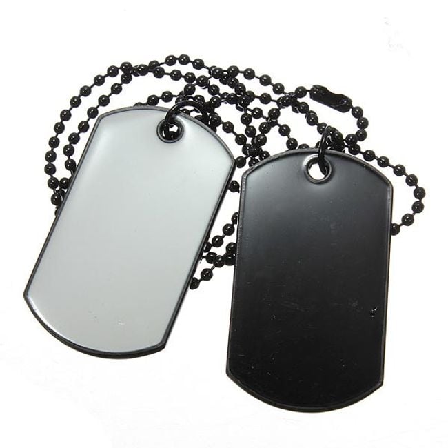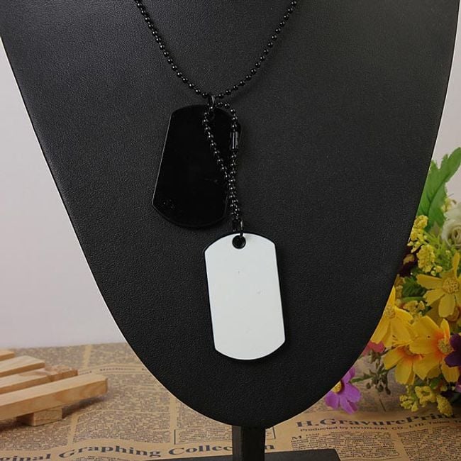 Neck chain in a classic "dog tag" design. It consists of a chain and 2 tags, one black and the other white. You can have inscriptions engraved on them according to your imagination.