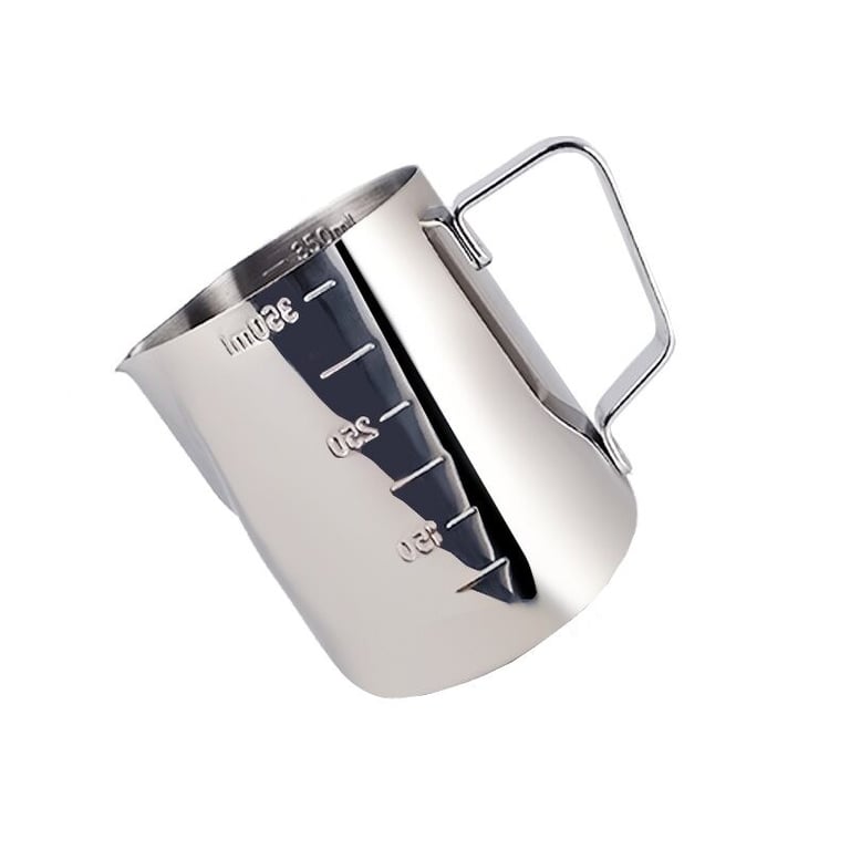 Professional milk jug. It is made of stainless steel and guarantees you long durability. There is a measurement mark on both the outside and inside for volume measurement. This allows you to keep track of the amount of milk in the jug. The mark measures up to 350 ml.