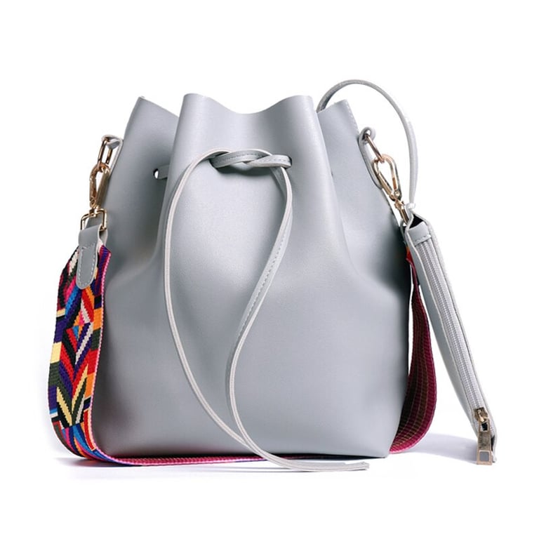 Women's bucket bag with a colourful wide strap and an additional adjustable long strap. Available in multiple colours.