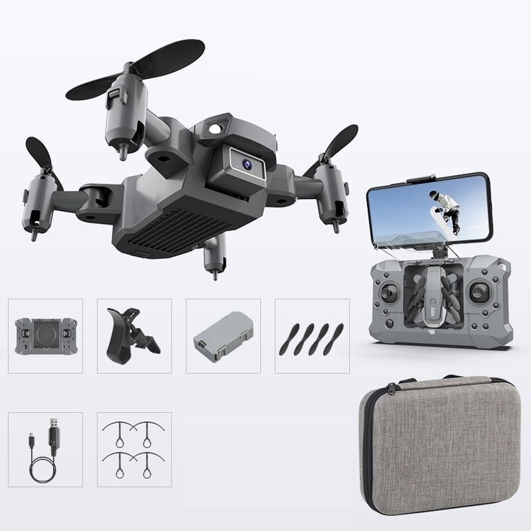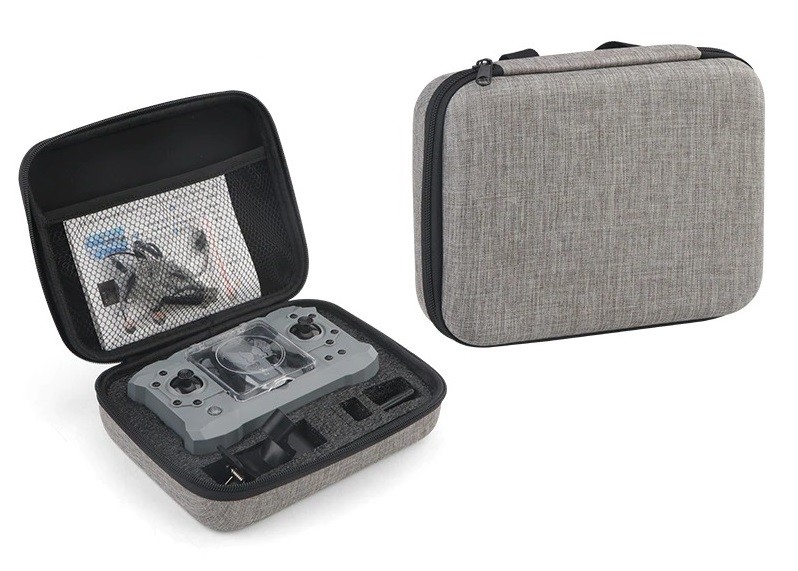Package contents: 1x drone, 1x battery, 1x controller, 1x USB cable, 4x protective ring, 4x spare propellers, 1x screwdriver, 1x bag