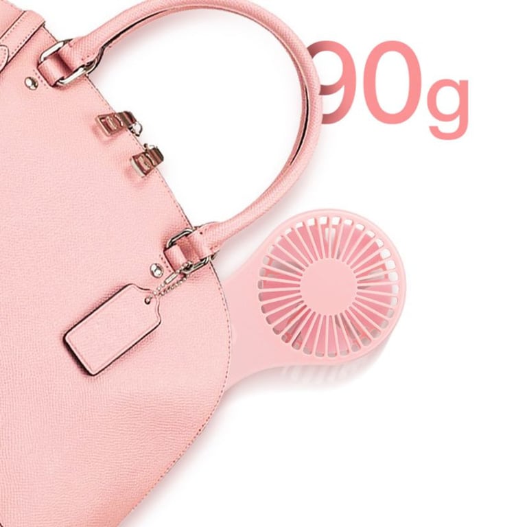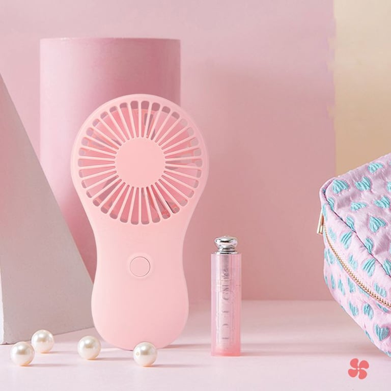 Small portable pocket fan. Quiet. Powered by batteries. Available in multiple colour variants.