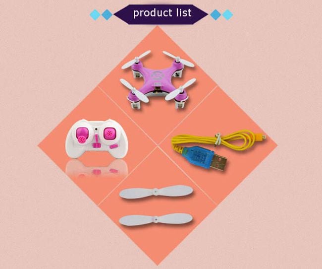 • Package contents: quadcopter, controller, charging USB cable, 2 spare propellers