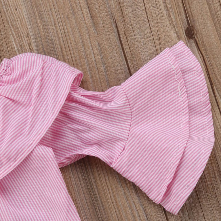 Set of top and trousers for a little girl. Pink top with a striped design, long sleeves and ruffles. White trousers with stylish cut-outs.