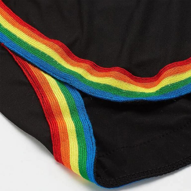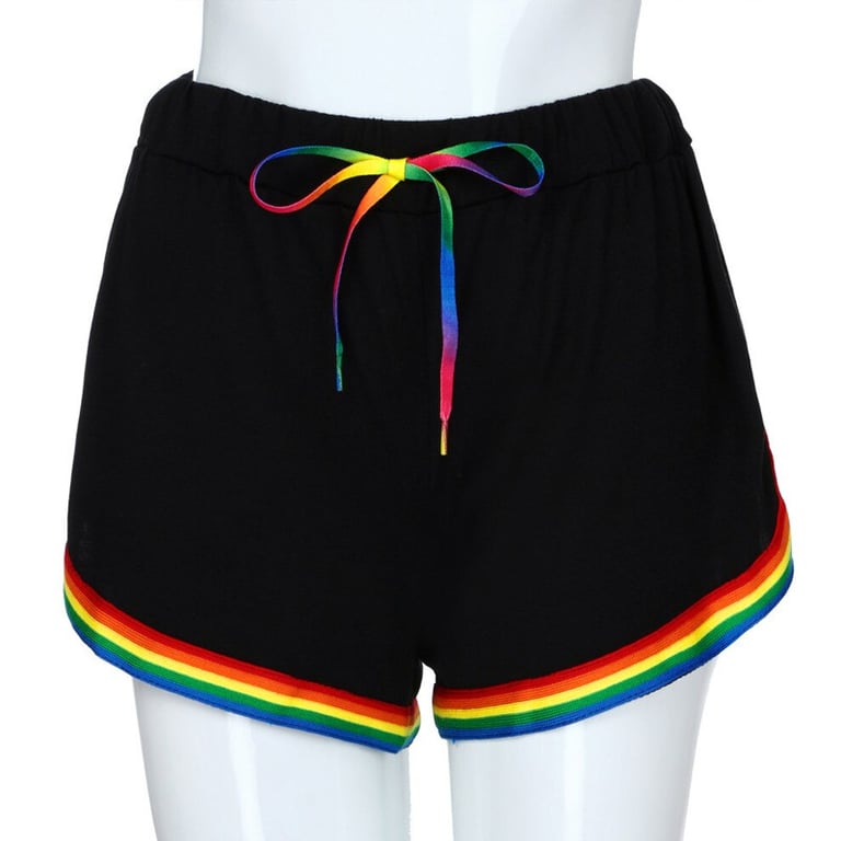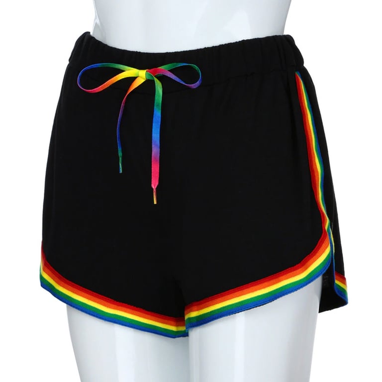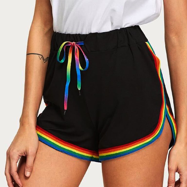 Shorts with a high-waisted cut and a decorative rainbow stripe around the hem. Stylish and very attractive for everyday wear.