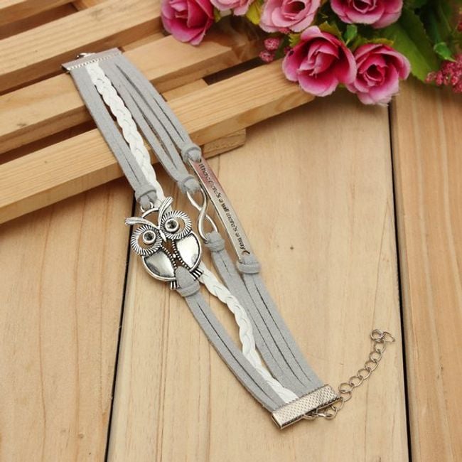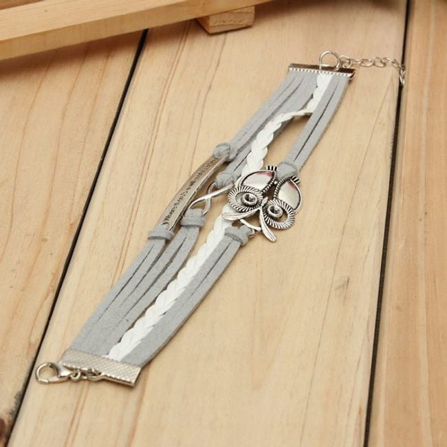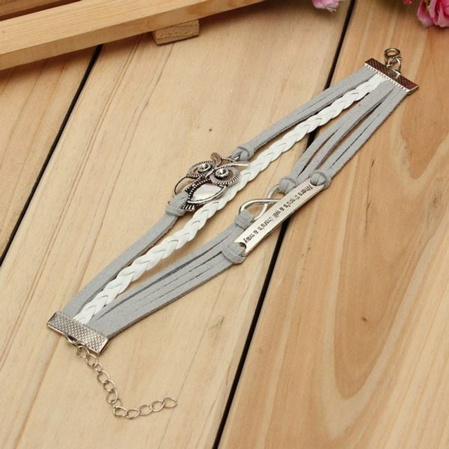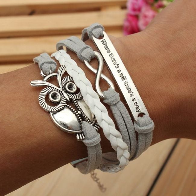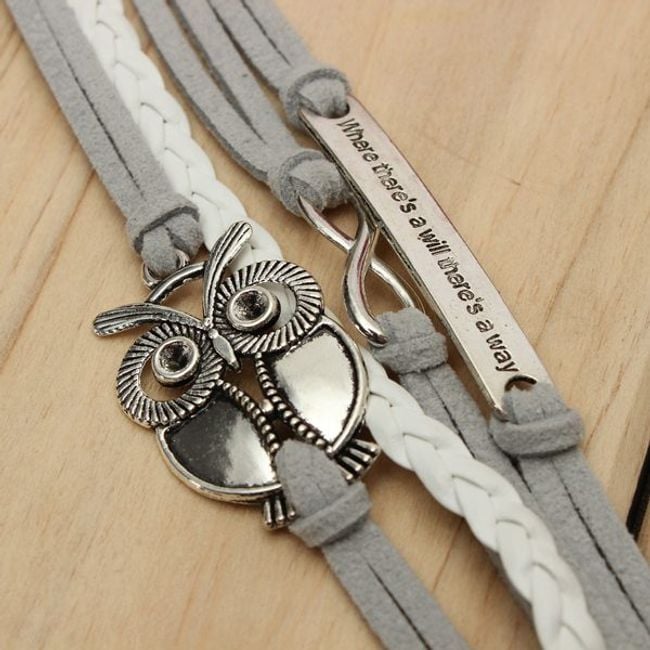 A modern bracelet featuring three attractive charm designs suitable for both ladies and gentlemen. The charms include an owl, infinity symbol, and the inscription “Where there is a will, there is a way”.