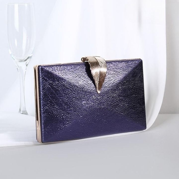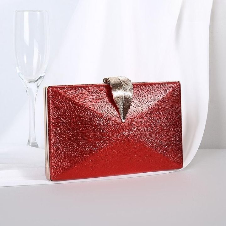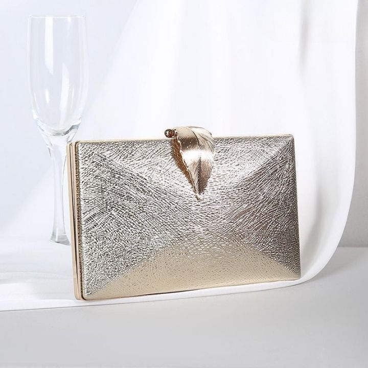 Luxurious shiny evening clutch bag with a decorative leaf-shaped clasp.