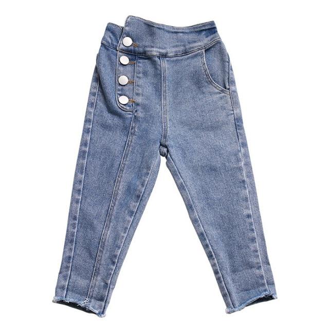 Beautiful modern girls' jeans with decorative buttons.