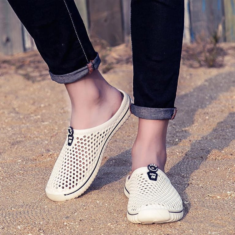 Rubber unisex slippers with a round closed toe and open heel. Grooved non-slip sole. Breathable. Available in multiple colour options.