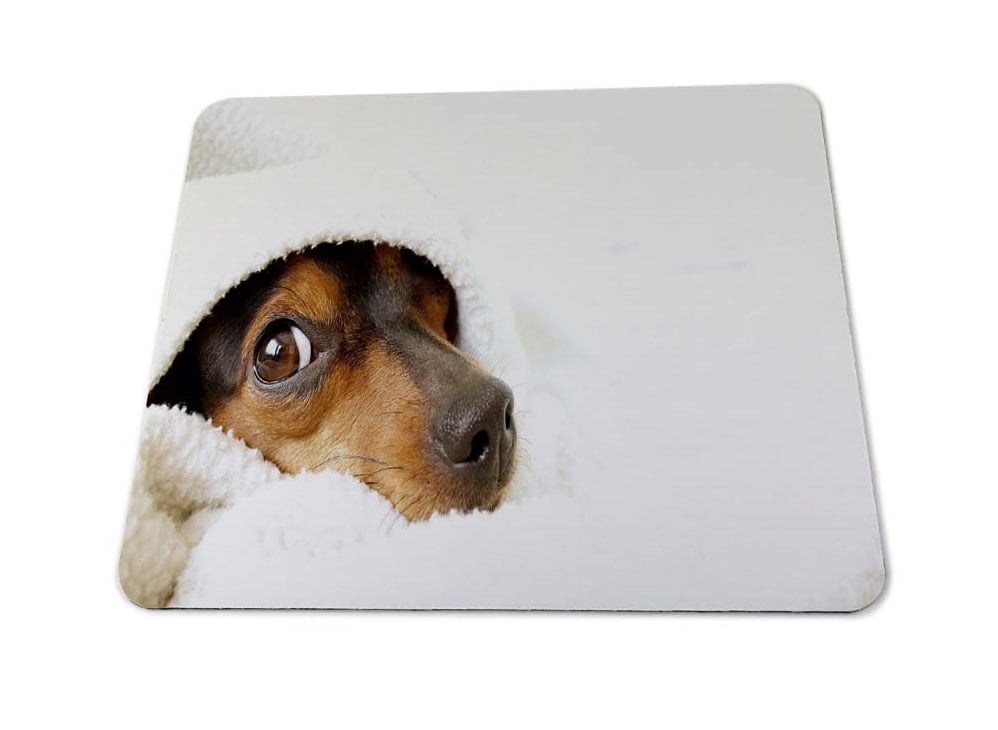 Beautiful mouse pad featuring a dachshund wrapped in a blanket.
