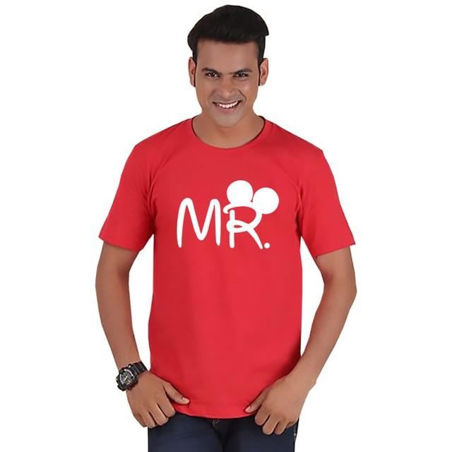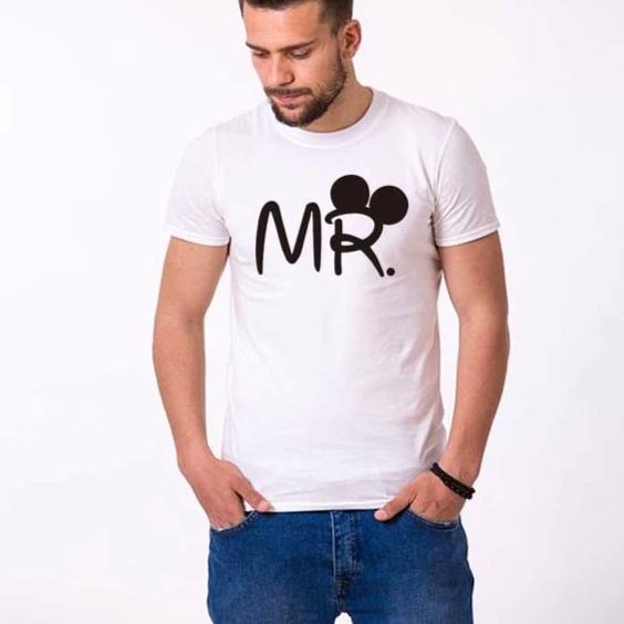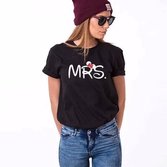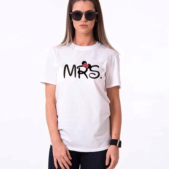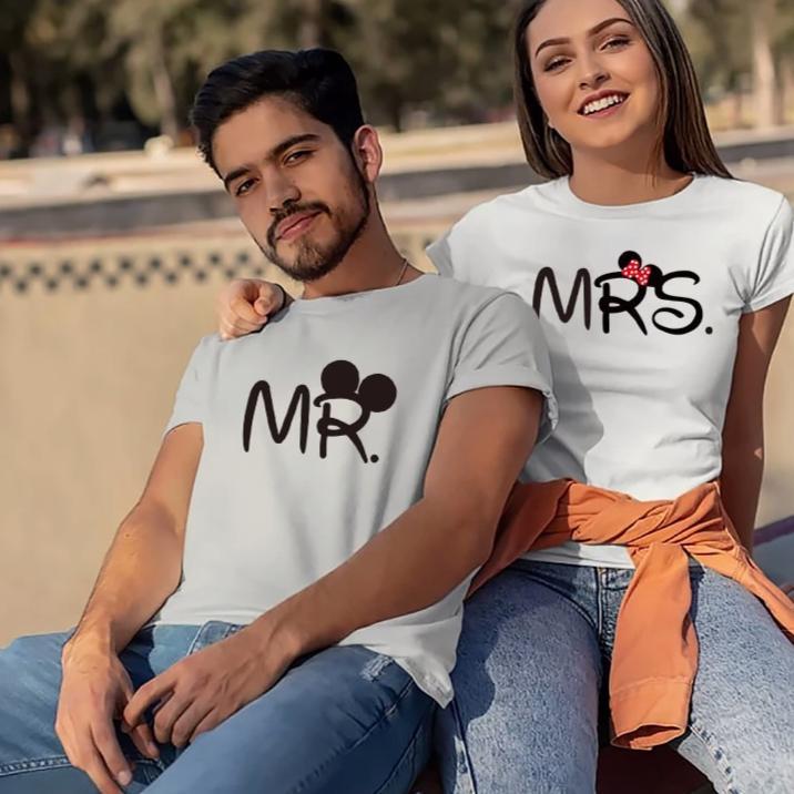 Fun couple's t-shirt with MR and MRS lettering in two basic colours. A blend of cotton and polyester.