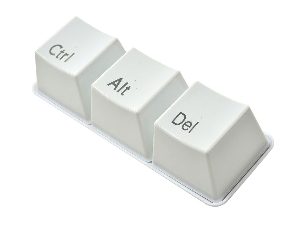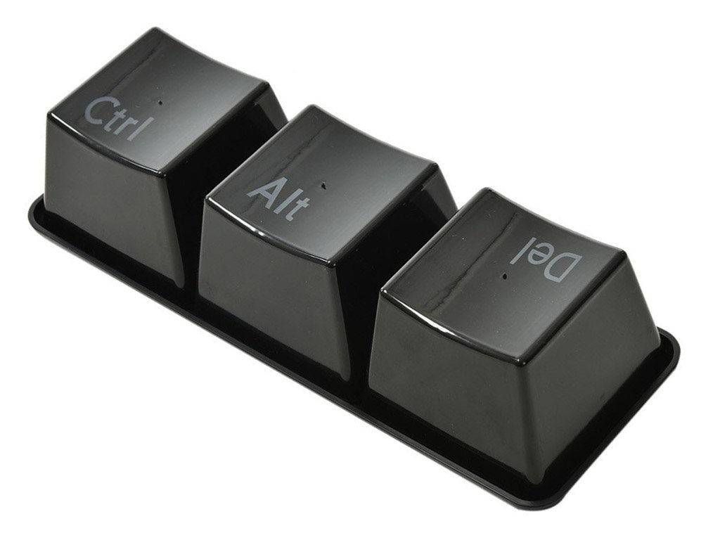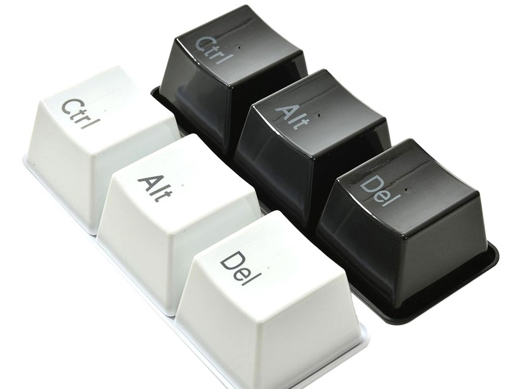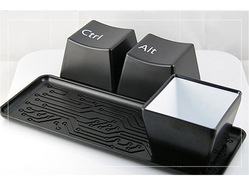 Stylish set of 3 mugs with a coaster, representing the keyboard shortcut Ctrl + Alt + Delete on a much larger scale than you find on your keyboard! They are made of plastic, perfect for serving tea, juice, and coffee to your favourite techie. Tip: You can play the game FIND THE BALL with them?