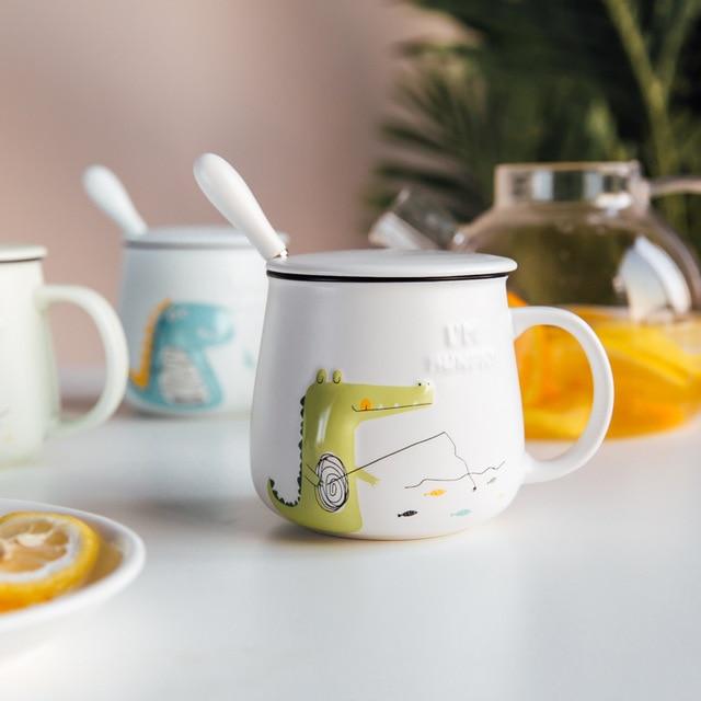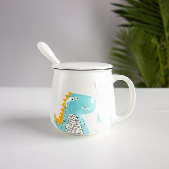 Mug with a dinosaur, with a lid and a spoon. Available in multiple colours.