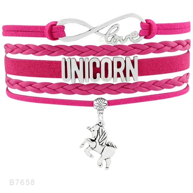 The bracelet is made up of several rows of coloured leather strips. It is adorned with a unicorn charm and the inscription UNICORN. You can choose from many colour combinations.