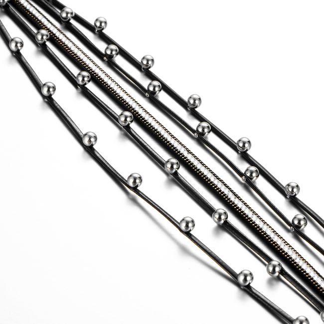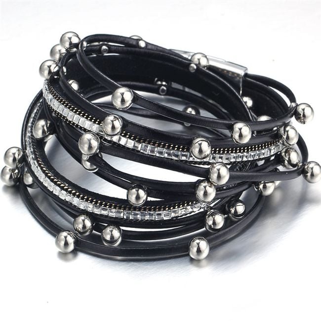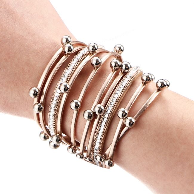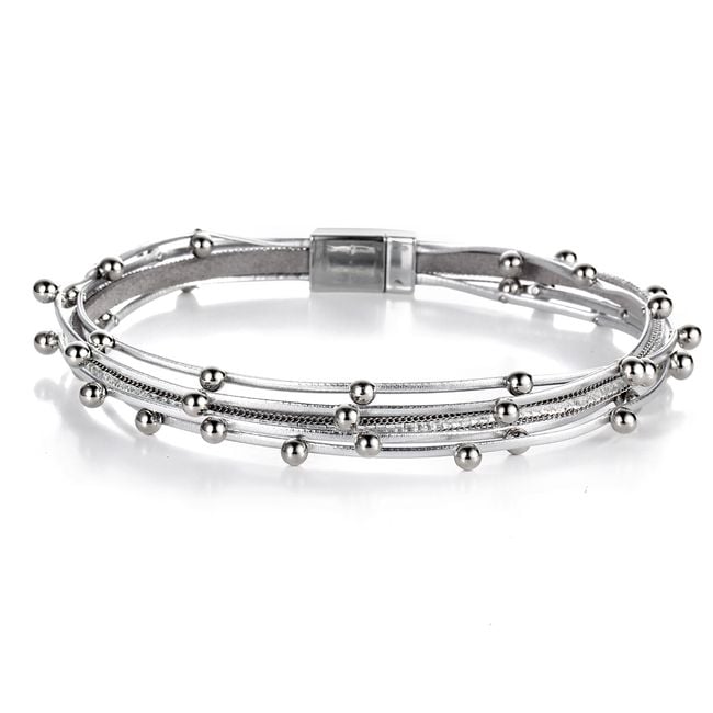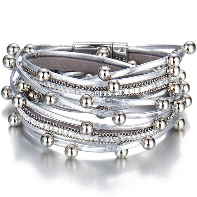 The multi-layered bracelet is adorned with numerous small silver-coloured beads.