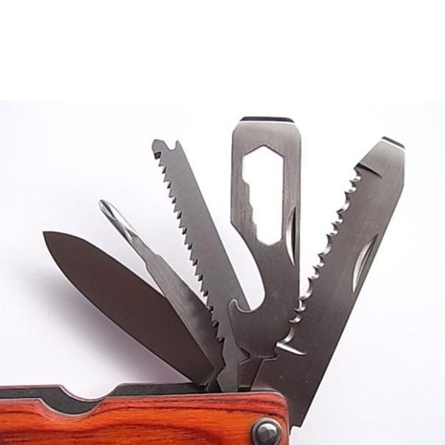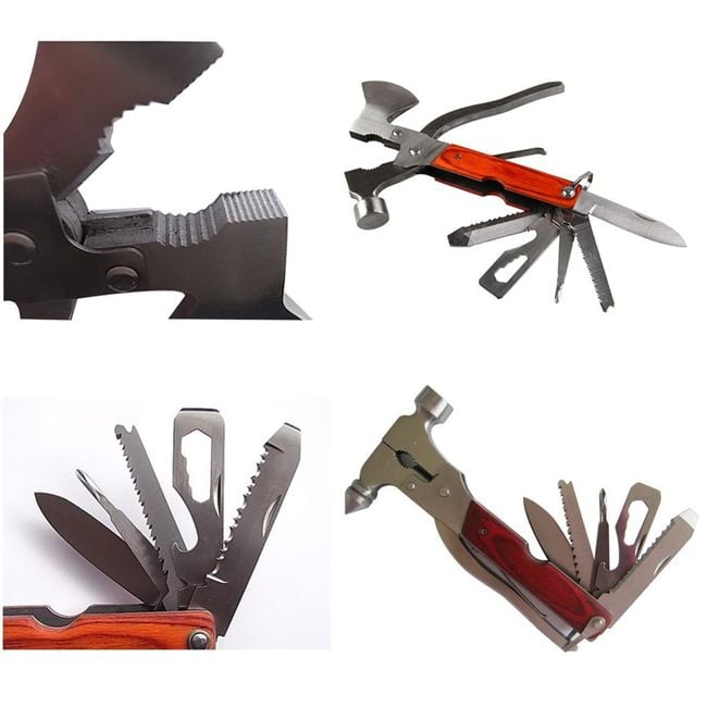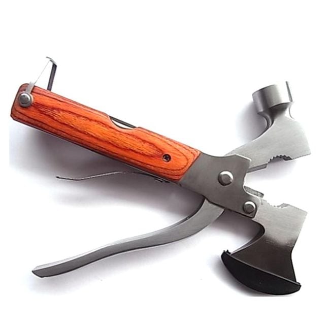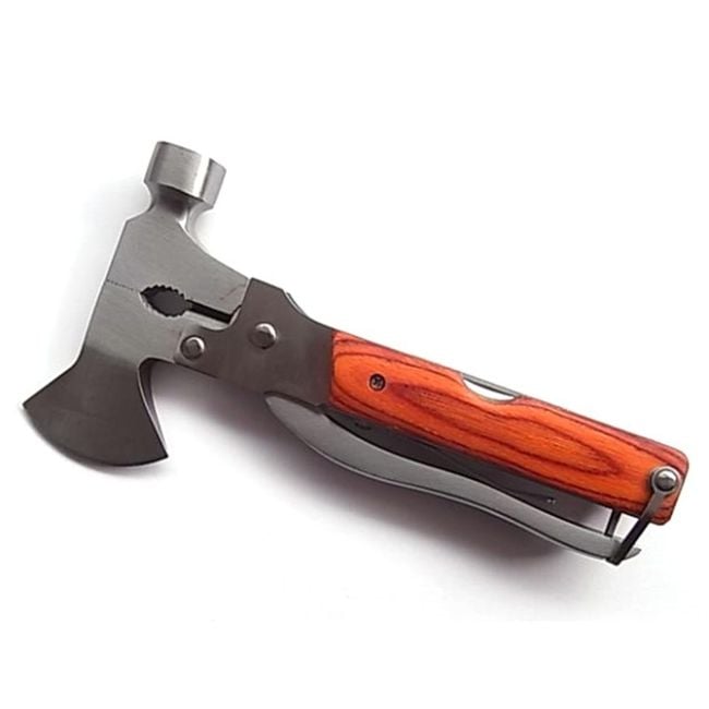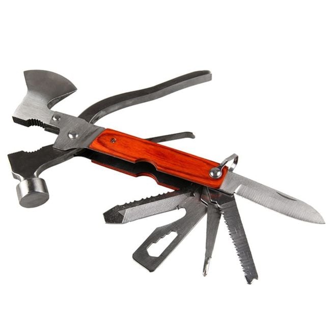 The multifunctional hammer also includes an axe, pliers, a knife, a screwdriver, a bottle opener, and a saw. It will be useful not only on the go but also at home.