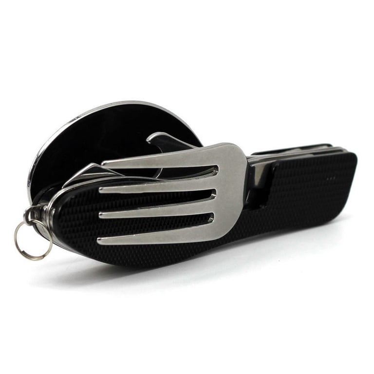 It consists of a fork, knife, spoon, and bottle opener.