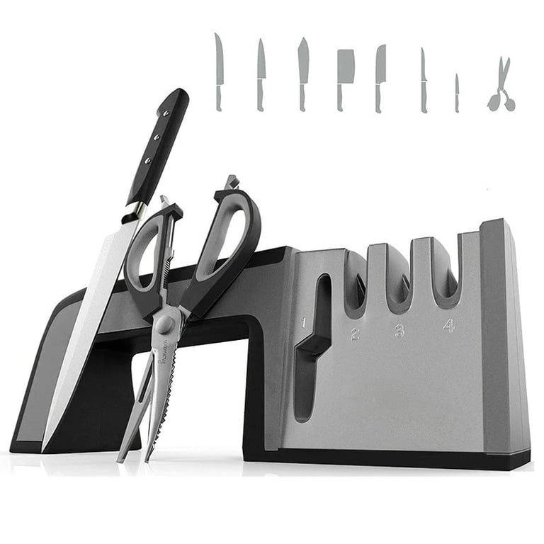The ergonomic sharpener with 4 sharpening slots will always be at hand for dull knives or scissors. Boning knives, filleting knives, or just vegetable knives will be sharp as a razor. Caution, avoid injury. The body is coated with silicone. When sharpening wet, it will not slip or slide from your hands.