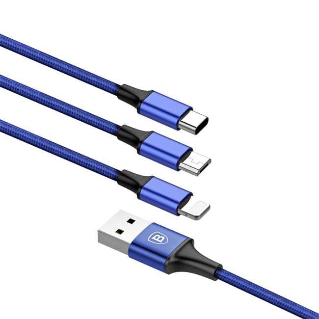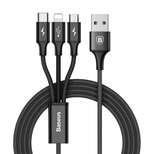 Do you have devices at home with different connectors and don't want to keep searching for the right cable? If so, you will love this cable! One end features a standard USB, while the other end is equipped with 3 different connectors – Micro USB, Lightning connector, and USB Type C. You can charge all your devices at once without having to search for multiple cables!