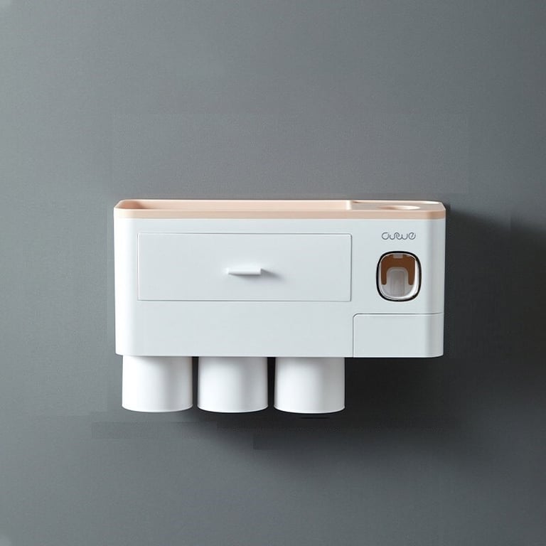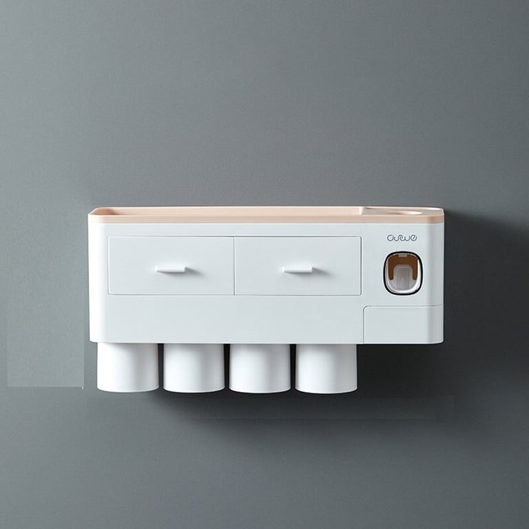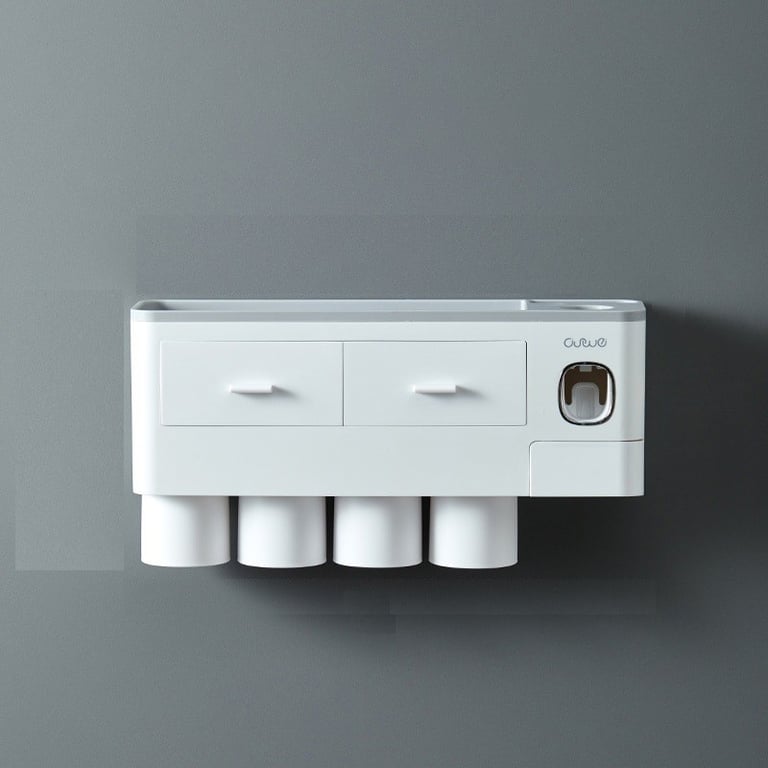 Includes a toothpaste dispenser, toothbrush holders, holders with cups, and a small drawer.