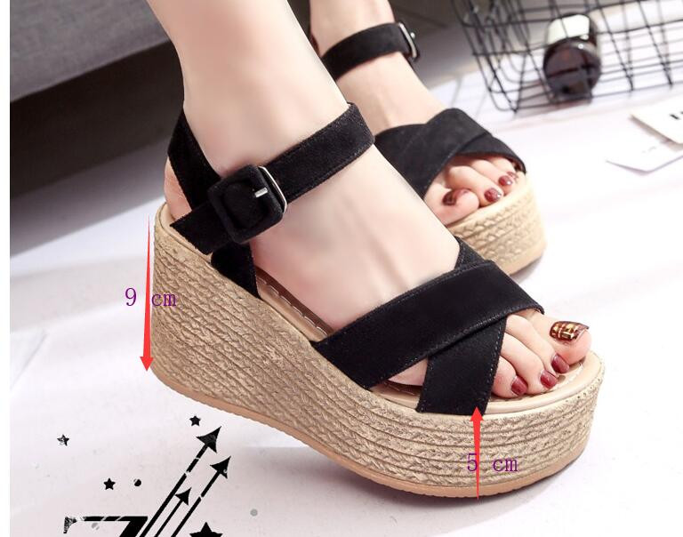 Fashion wedge sandals. Strappy shoes in black.