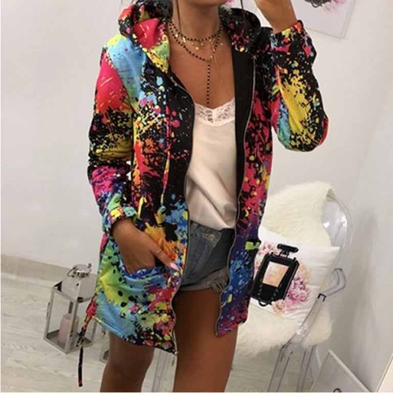Women's lightweight jacket with a hood and drawstrings. Loose, longer fit with a zip fastening. Side pockets. Colourful print. Available in two variants.