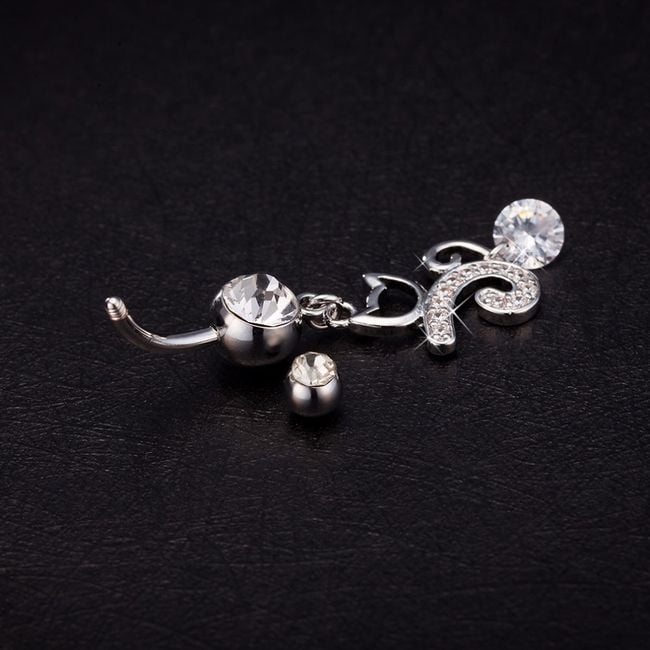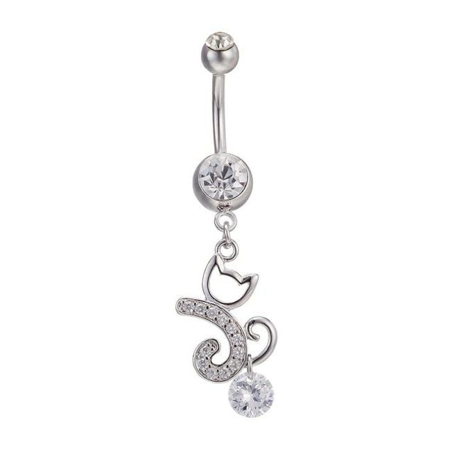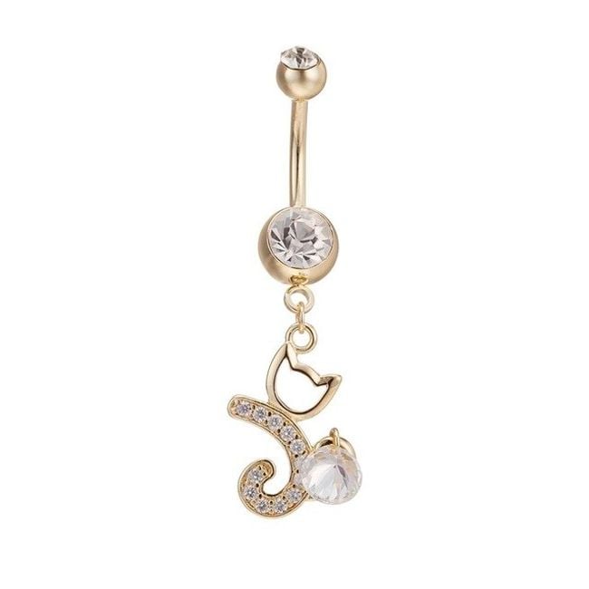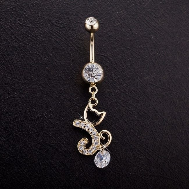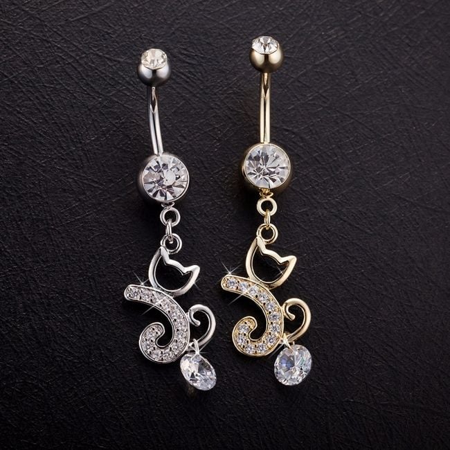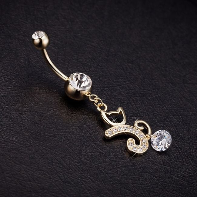 Give your belly button a new decoration with a dangling cat. The piercing is available in gold and silver.