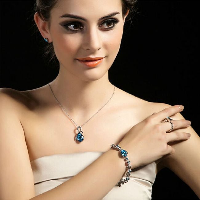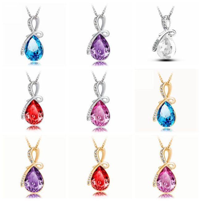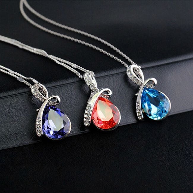 The drop-shaped pendant necklace will be perfect for festive and social events and will beautifully complement any of your outfits. It is available in five colour variants. The drop is a symbol of life, perfection, and purity. The silver part of the pendant is adorned with tiny cut glass stones.