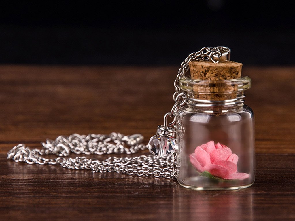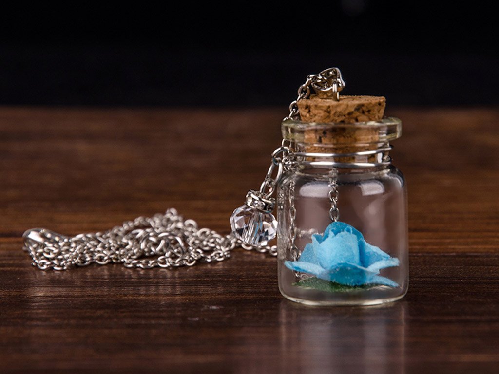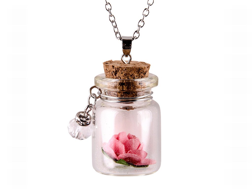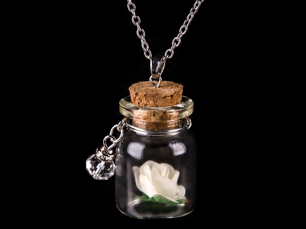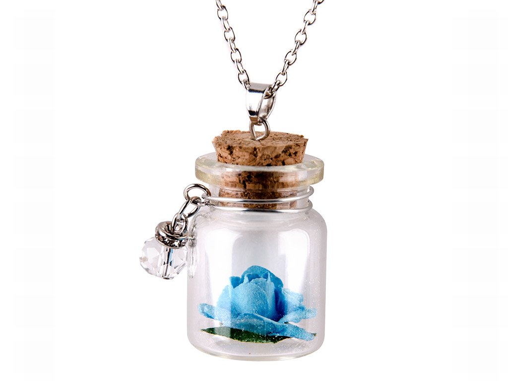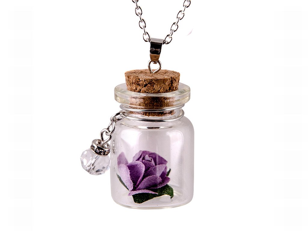 The small bottle with a stopper hides flowers of various colours that glow in the dark when illuminated. This beautiful pendant makes a lovely gift for a girlfriend or friend. Luminous flowers.