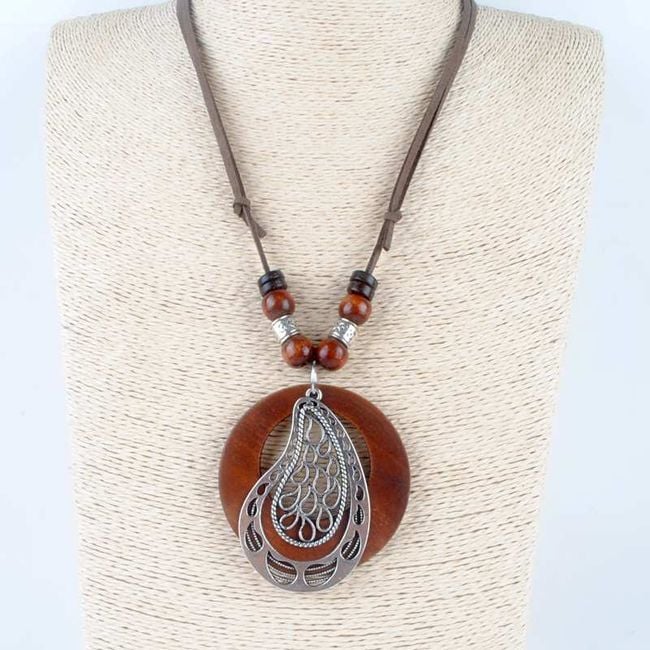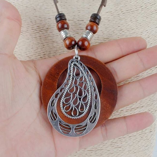 A large drop made up of smaller drops has a wooden ring suspended behind it. The length of the necklace is adjustable.