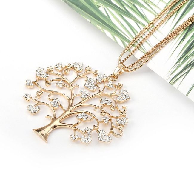 The multi-layered chain necklace is adorned with a pendant in the shape of a tree.