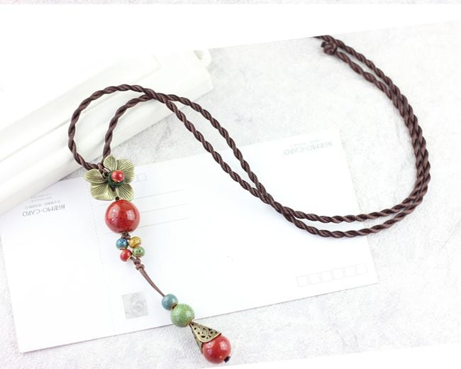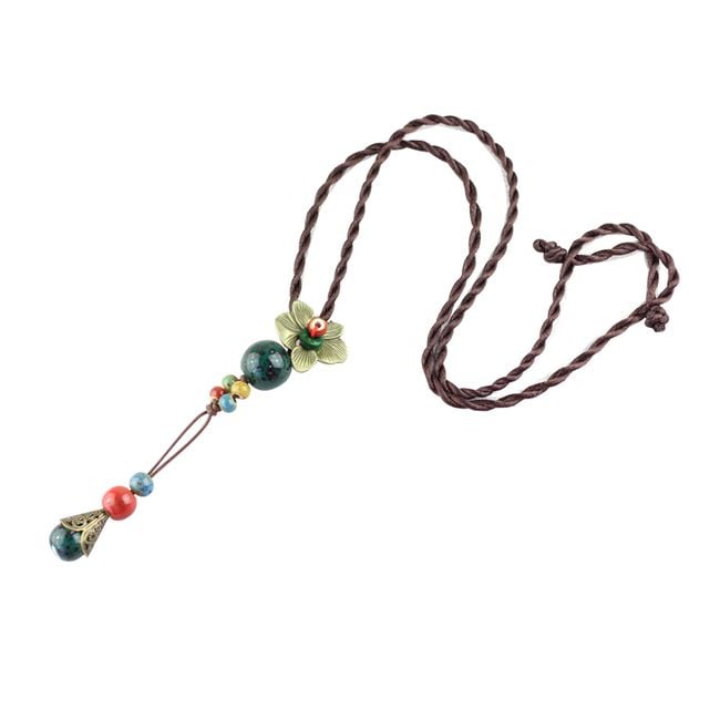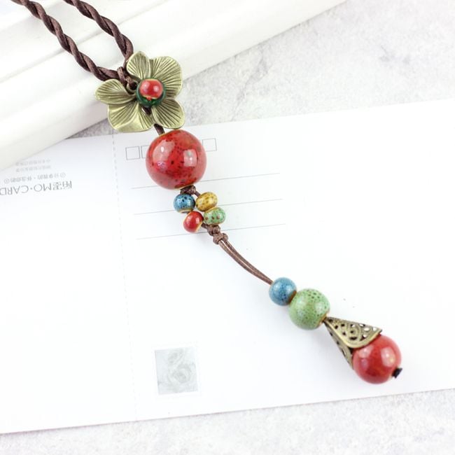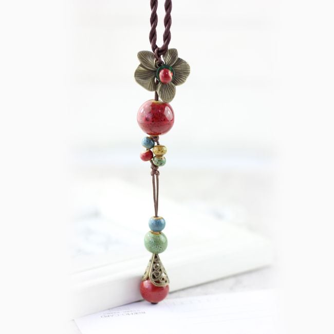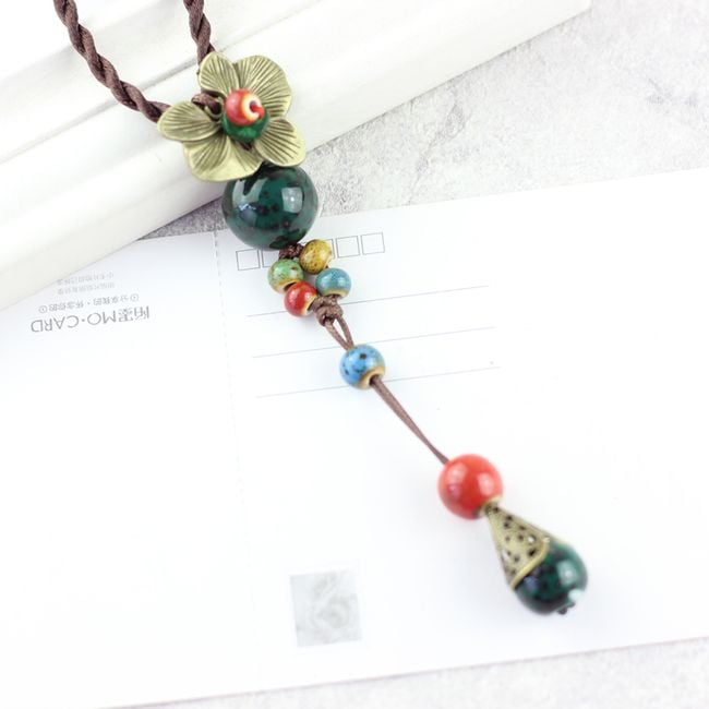 Women's ethnic necklace with ceramic beads and a metal flower.