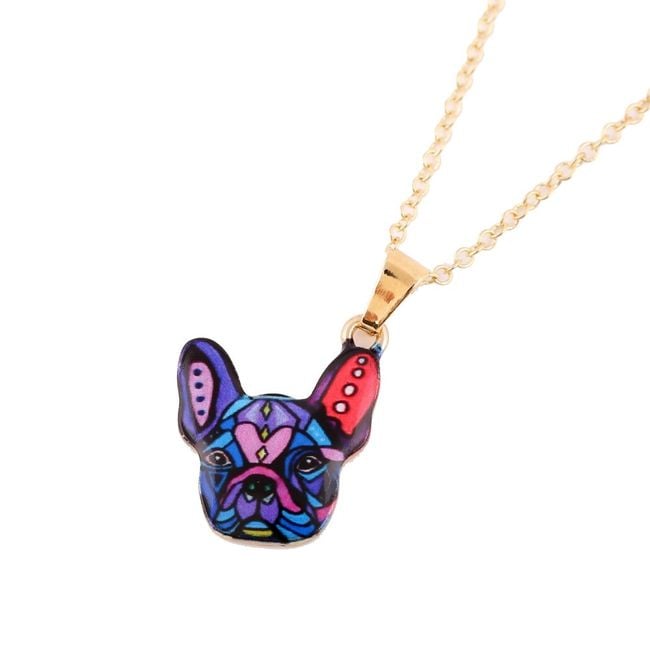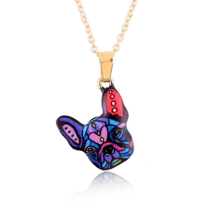 The necklace is gold in colour and is adorned with a colourful bulldog, making it a perfect gift for anyone who owns this adorable breed.