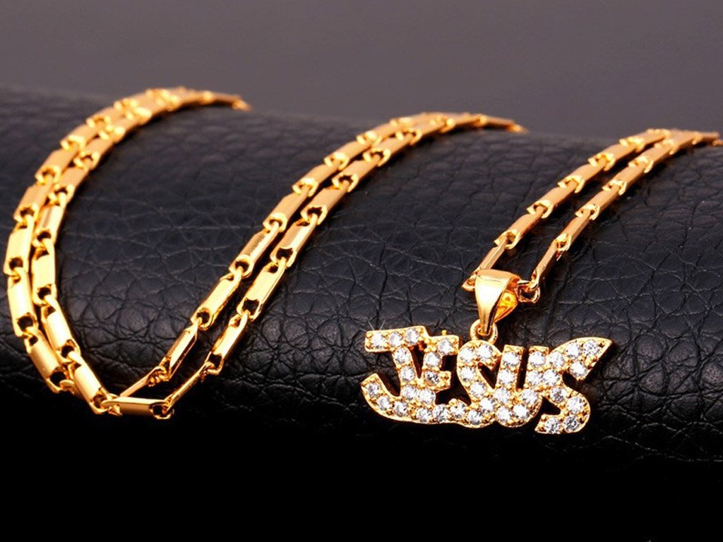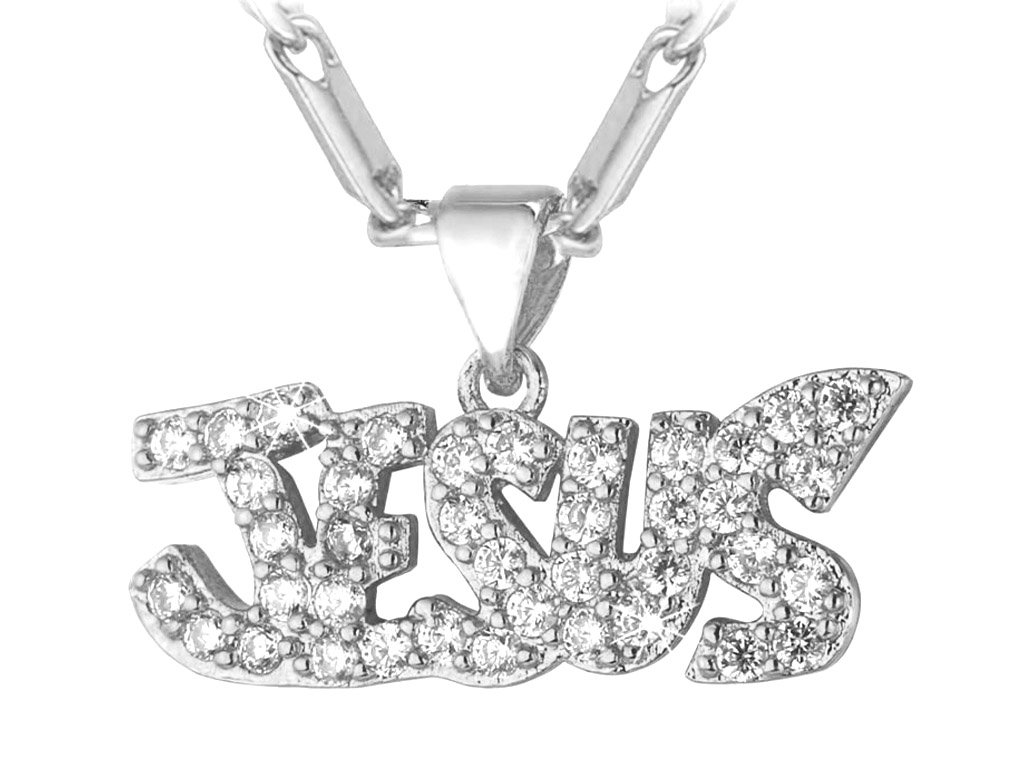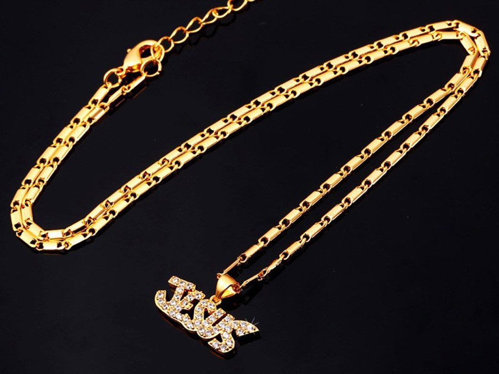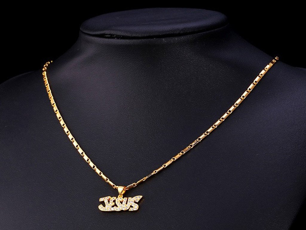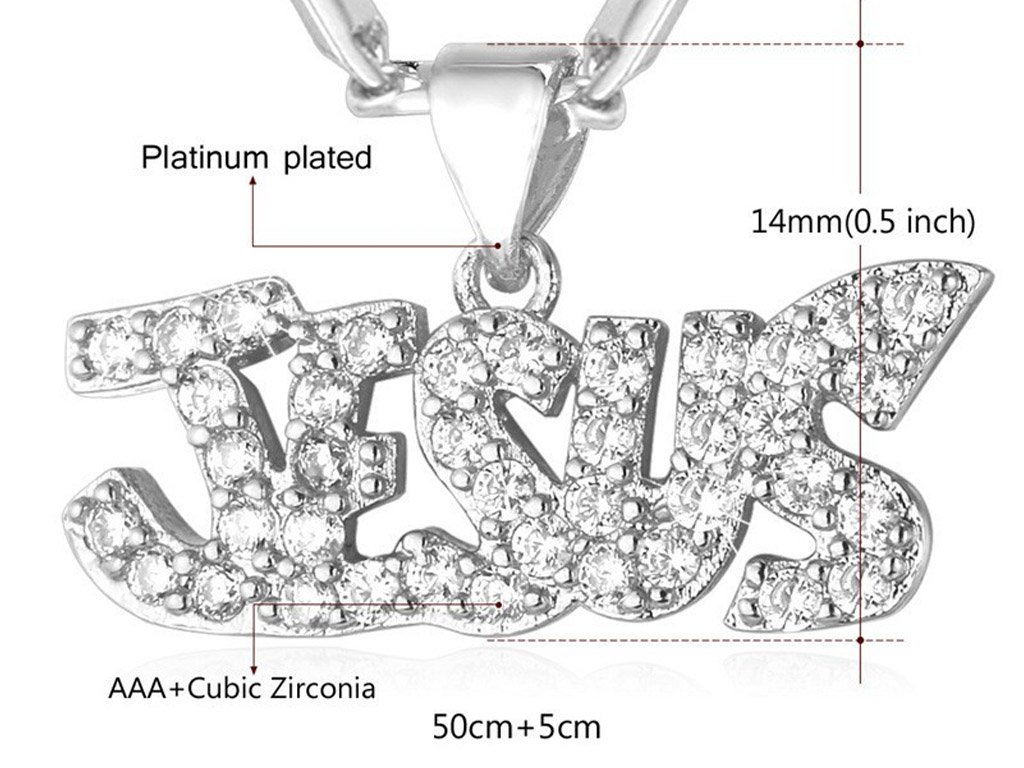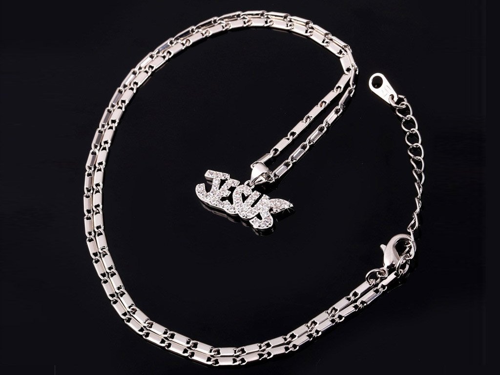 The necklace with the JESUS pendant features a unique design and a Christian inscription of Jesus, which is inlaid with clear stones. Choose from two colour options.