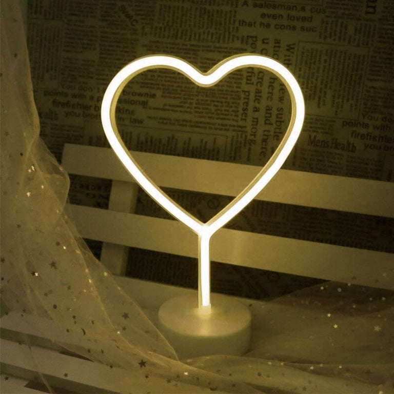 Decorative lamp with neon LED lighting. With a base. Height approximately 30 cm. Powered by batteries. Heart motif.