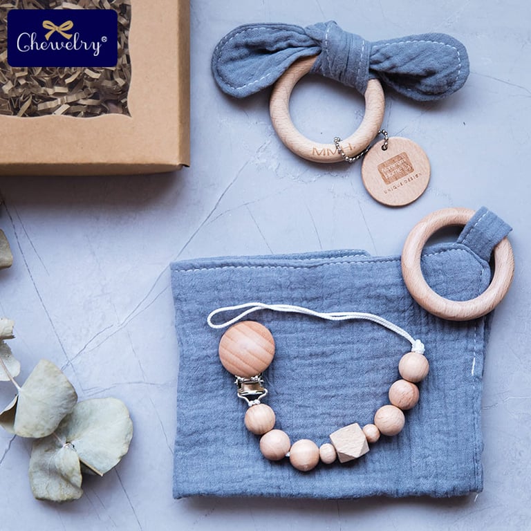 The newborn set – pacifier clip + towel + teether is a great and stylish accessory for your baby.