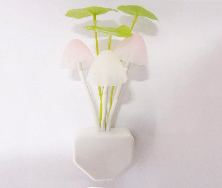 3 cute mushrooms light up in three colours: pink, yellow, and purple.