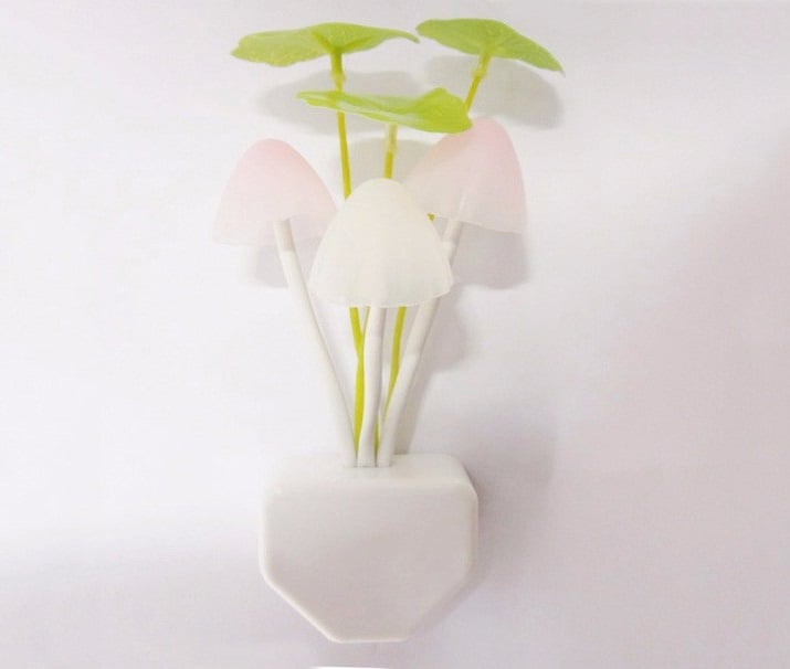 Almost everyone will fall in love with THIS MUSHROOM lamp, which features adorable mushrooms, several leaves, and a white ceramic pot.