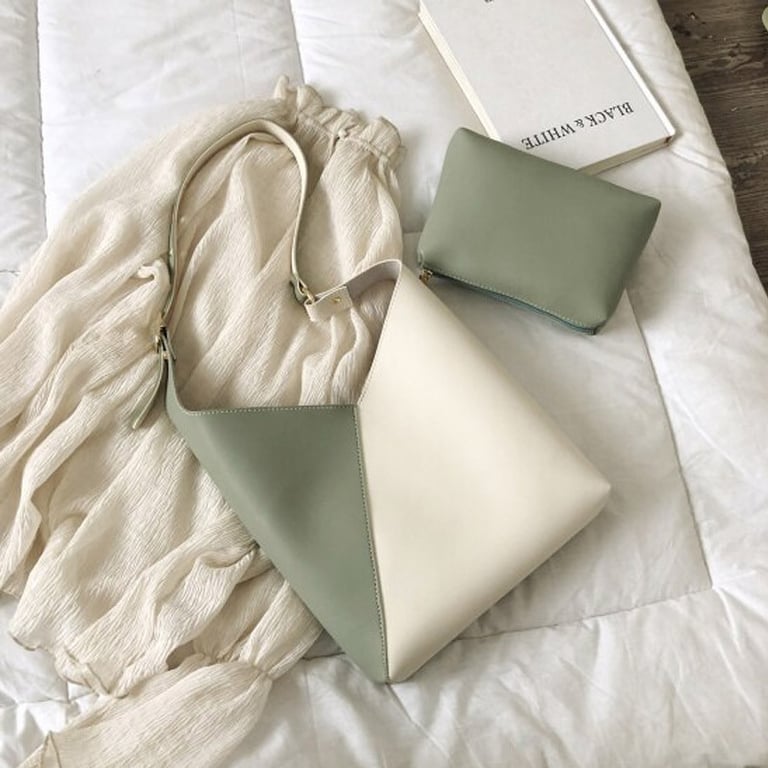 Set of women's handbag and small zip pouch. The handbag has an adjustable shoulder strap. Leather look.